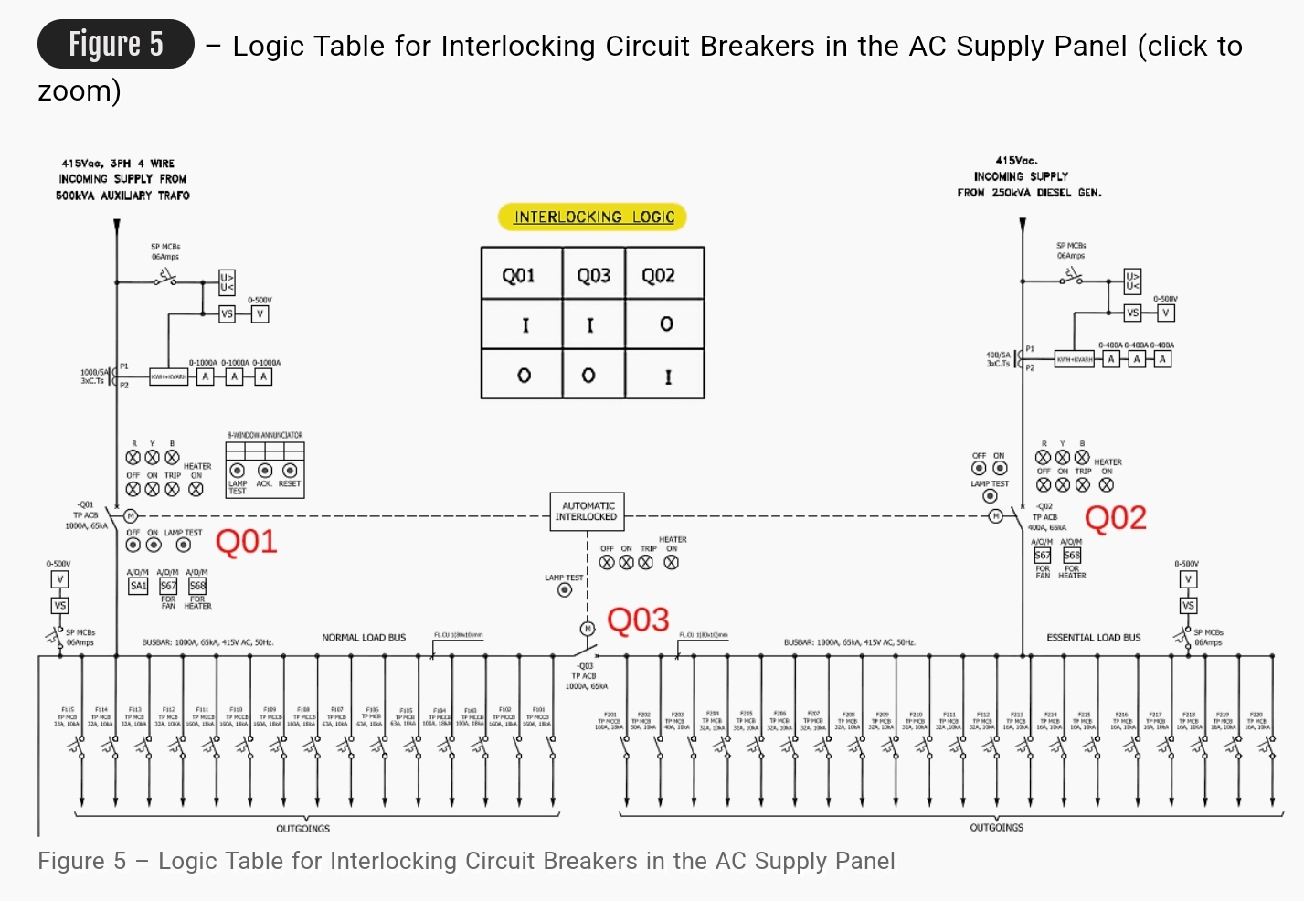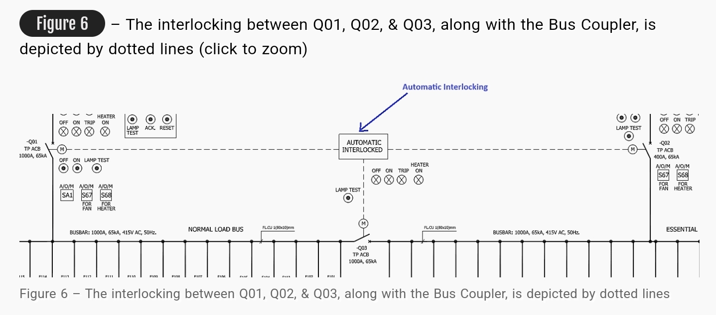 Q03으로 지정된 버스 커플러의 정격은 1000암페어로 보조 공급 인입 피더 회로 차단기의 정격과 일치합니다. Q03은 모터로 작동하는 회로 차단기로, 원안의 문자 M에서 이를 나타냅니다. 세 개의 회로 차단기 사이에는 인터록 메커니즘이 있습니다: Q01(보조 공급 인입 피더), Q02(디젤 발전기 인입 피더), Q03(버스 커플러).