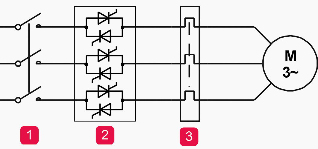 전자식 소프트 스타터는 모터의 각 상에 직렬로 연결된 임피던스를 통해 모터에 인가되는 전압을 제어합니다. 임피던스는 AC 스위치(역병렬 연결 SCR-다이오드 또는 SCR-SCR 회로)로 제공됩니다. 전압은 SCR의 통전 각도를 변경하여 제어합니다.