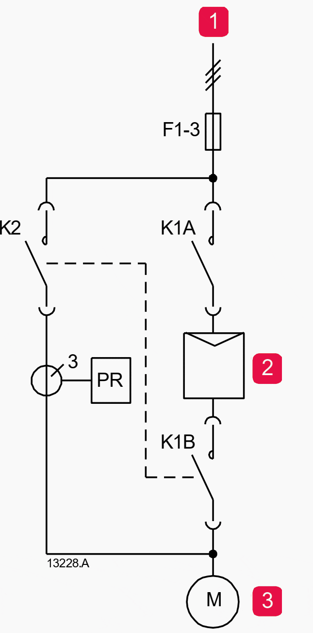 2. 접촉기 K1B와 K2는 전기적, 기계적으로 인터록되어 있습니다. 접촉기 K1A와 K1B를 인출하여 VFD를 전원에서 분리할 수 있습니다.