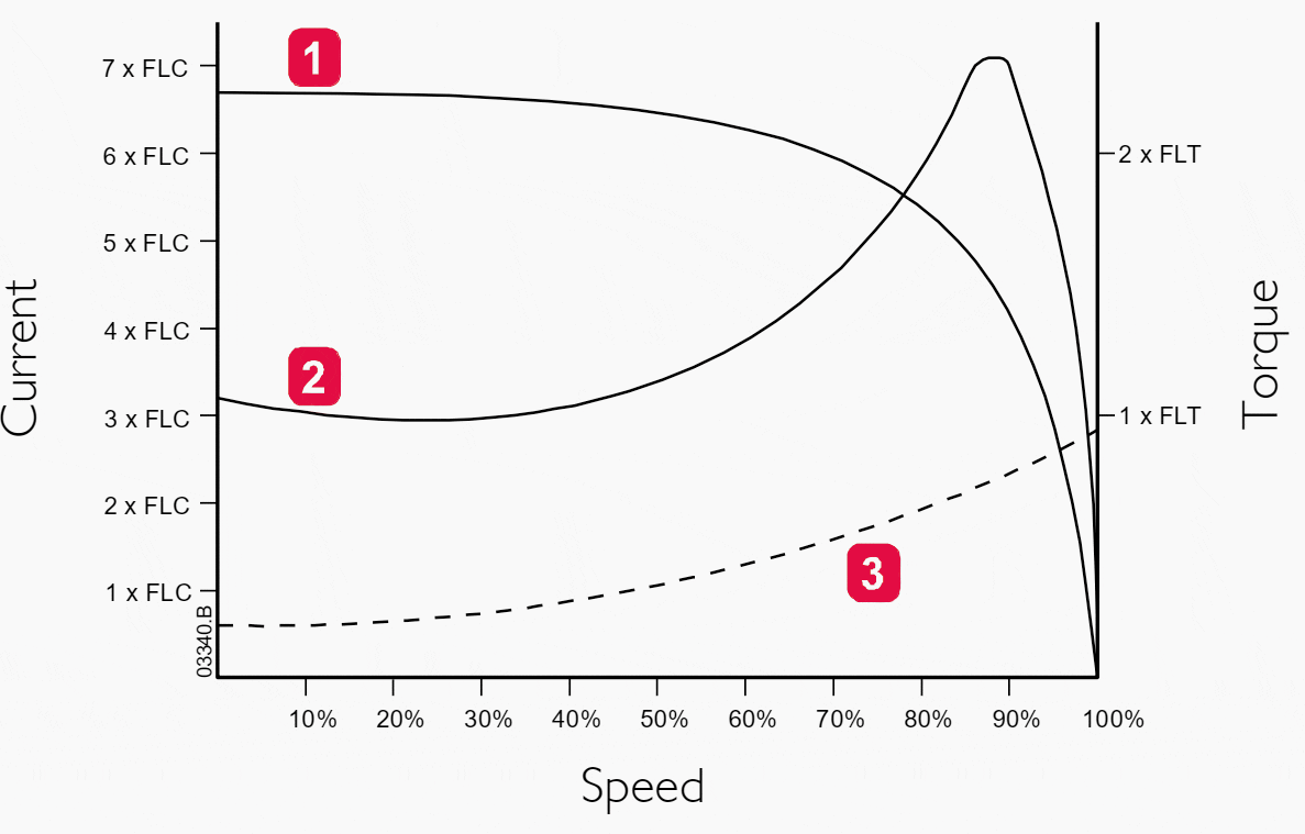 유도 모터가 전 전압 공급 장치에 연결되면 모터의 정격 전류의 몇 배가 흐르게 됩니다. 부하가 가속되면 일반적으로 사용 가능한 토크가 약간 감소했다가 정점으로 상승하는 반면, 전류는 모터가 최대 속도에 가까워질 때까지 매우 높게 유지됩니다.