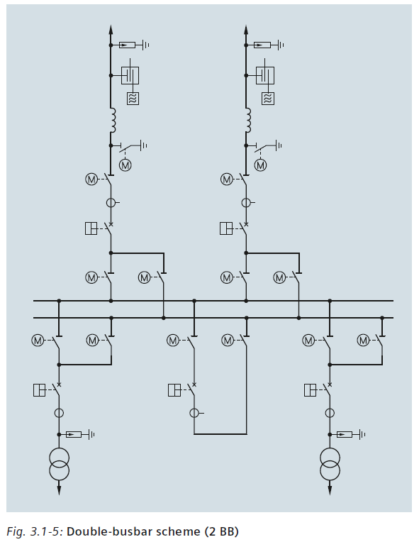 더 복잡한 이중 버스바 시스템의 방식은 변전소 운영 중 훨씬 더 많은 유연성과 신뢰성을 제공합니다(그림 3.1-5). 이러한 이유로 이 방식은 전력 공급 시스템의 노드에 있는 배전 및 변압기 변전소에서 사용됩니다. 버스바를 독립적으로 사용하고 한 버스바에서 다른 버스바로 피더를 전환하여 전력 흐름을 제어할 수 있습니다. 버스바 단로기는 피더의 정격 전류를 차단할 수 없기 때문에 전력 흐름에 짧은 차질이 발생합니다.