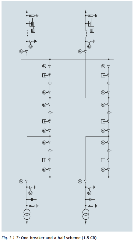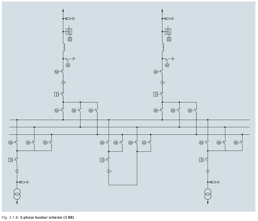 보다 높은 전압 레벨을 위해 송전 시스템의 노드에서 중요한 변전소의 경우 3상 버스바 방식이 사용됩니다. 380kV 수준에서 사용되는 독일의 일반적인 방식입니다(그림 3.1-8)