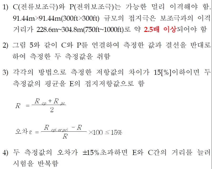 4) 간이 3전극법은 P전극이 50% 위치에 설치하고 E 와 C 간격을 10 - 20m로 해서 측정하는 것인데 이 정도면 어느 정도의 정확성을 확보할 수 있다고 생각됩니다. 그런데 실제로 이렇게 간이 접지봉을 설치하여 저항을 측정하시는지는 의문입니다.