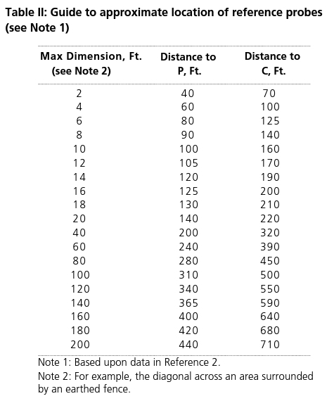 Megger 자료에서 설명하기를 “Maximum Dimension” figure by taking the diagonal distance across your electrode system area. For example, if the area measures 100 by 100 ft, the diagonal equals about 140 ft. From the table, you run down the first column to 140 and read across. P should be 365 ft from the electrode and C should be 590 ft." 즉 최대치는 접지극 시스템의 면적에서 대각선의 길이라고 합니다. 이렇게 정의가 확실하면 이해가 잘 되는데 이런 정의를 설명해 주는 자료를 찾기가 참 어렵습니다. 그래서 아래의 표에서 자기 접지 Mesh의 대각선 수치를 찾으면 얼마의 간격으로 보조 전극을 설치해야 하는지가 명확해집니다.