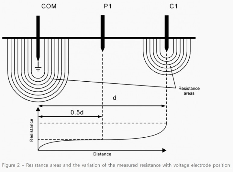 접지극과 P극, C극 사이의 간격이 충분해야 간섭되는 사항을 줄일 수 있습니다. IEEE 81-2012, 8.2.2.4에 따르면 가장 큰 접지전극 사이즈의 5배 이상의 거리를 확보하도록 하고 있습니다. 위의 접지저항계 카탈로그에는 10-20m 간격을 띄우라고 되어 있습니다. 좀 더 많이 띄우면 간섭이 줄어서 정밀도가 높아집니다.
