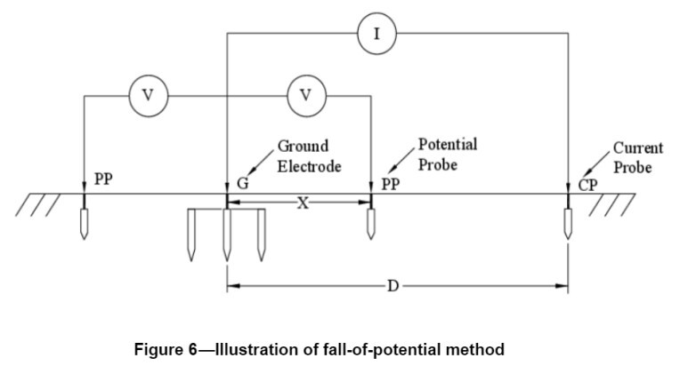 3전극법, 즉 "전위 강하법 (fall of potential method)"이라고 불리는 방법은 측정할 접지극과 다른 전기적으로 독립된 시험 전극 2개(P(전위)와 C(전류)로 표시됨)로 구성됩니다. 이 시험 전극은 접지저항이 높아도 됩니다. 하지만 측정할 전극과 전기적으로 독립되어야 합니다.