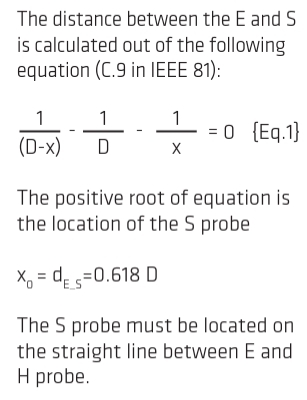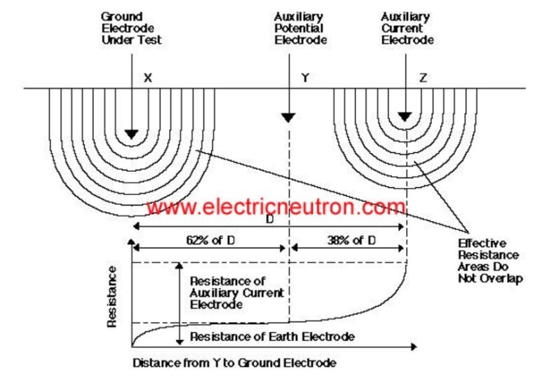 위의 3전극법에서는 전압전극 PP의 위치가 50% 지점 (0.5d)로 표시되어 있습니다. 그런데 위에 설명한 3전극법에서 전압전극 (PP)의 위치를 전류전극 (CP) 거리의 62% 위치에 설치하는 것이 더 좋은 결과를 얻을 수 있습니다. 이는 이 위치가 전압전극이 접지극이나 전류전극의 영향을 최소로 받는 위치로 가장 정확한 접지저항을 측정할 수 있는 방법으로 IEEE 81-2012에서 제시하고 있습니다 (62% Rule). 이 방법은 중간 크기의 접지 시스템에서 적용이 되고 메시 접지극의 접지 저항을 측정하는데도 사용됩니다. 이 방법에서도 P 전극을 좌우로 10% 이동해서 3번의 측정을 하는 것은 유효합니다.