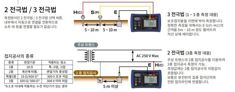 아래 카탈로그 자료를 보면 3전극법은 낮은 접지저항을 측정하는 데 사용되고 이전의 국내 규정인 1종 접지까지 측정이 가능하도록 되어있습니다. 이 방법은 위에 설명한 3전극법 (전위강하법)을 사용하는 것인데 아래 카탈로그에서 보면 E와 C의 간격이 20m에 불과합니다. 즉 어느정도 간이 측정법인 것이죠. 접지봉 한 개의 접지 저항을 측정하는데 적용하는 간격입니다. 3번 항에서 접지봉 2m 짜리의 접지 저항 측정에 사용하는 간격입니다. 따라서 이런 방법으로 측정된 값은 변화량을 참고하는 수치로 이해해야 합니다. 3전극법으로 실제 정확한 접지 저항을 측정하려면 위의 3항에서 설명한 간격을 적용해야 합니다.