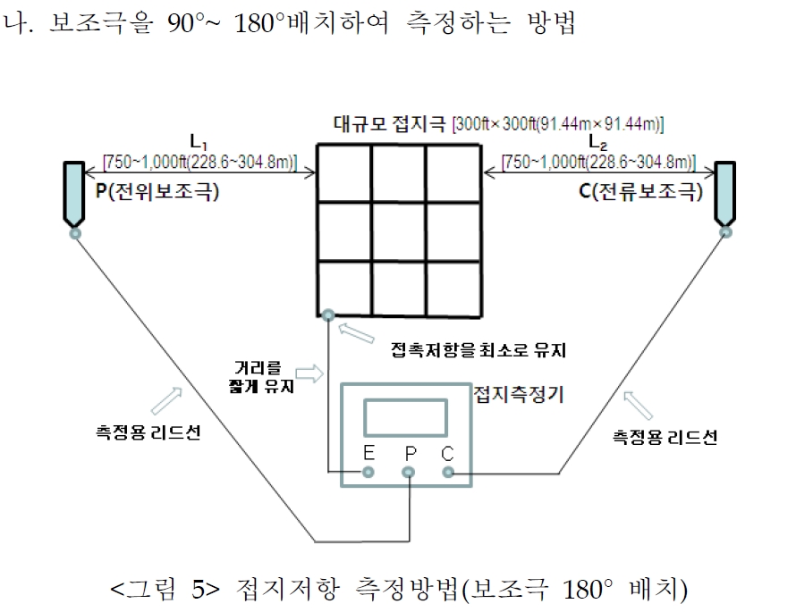 국내의 전기안전공사의 "공통 통합 접지 검사업무 처리방법"에는 아래와 같은 방법이 제시되었습니다. 대형 메시 접지극의 경우 거리의 제약으로 인해서 위의 3전극법을 적용하기 어려운 경우에는 전압극과 전류극을 대칭으로 설치하는 방법을 사용할 수 있습니다.