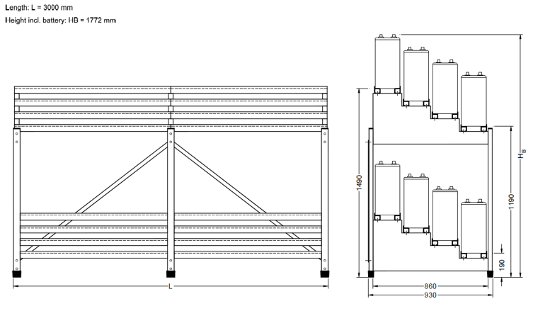 UPS는 일반적으로 아래의 그림과 같은 RACK에 BATTERY를 설치하고 별도의 BATTERY ROOM 내에 배치합니다. 평상시의 유지관리를 위해서 적절한 공간을 확보하는 것이 중요합니다. RACK은 접지되어야 합니다.