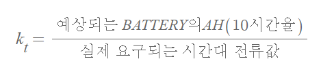 아래의 설명에서 보여주고 있듯이 kt 용량환산계수는 사용할 BATTERY의 시간율과 실제 적용되는 시간율에서의 방전 전류가 다르기 때문에 이를 보정하기 위해 사용하는 계수입니다.