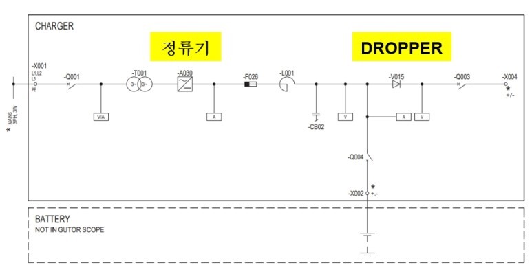 Battery Charger는 AC를 DC로 변환하여 Battery를 충전하고 DC 부하를 공급하는 역할을 합니다. 주요 부품으로는 TR, 정류기 (Converter), 안정기, Dropper (전압강하기), 그 외 차단기로 구성됩니다. 아래의 단선도는 Gutor에서 제출했던 도면의 Copy입니다.