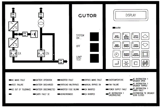GUTOR의 UPS는 아래 그림과 같은 제어반을 가지고 있습니다. MIMIC 을 통해 어떻게 운전되고 있는지를 보여주며 각종 ALARM이 표시되고 DISPLAY SCREEN과 CONTROL BUTTON들이 설치되어 있습니다.