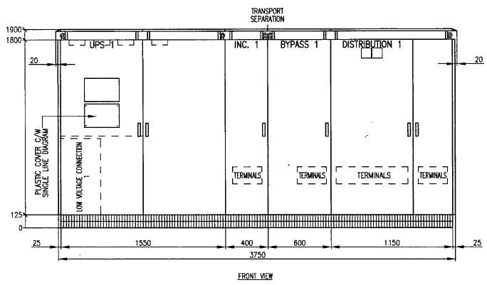 아래의 도면은 GUTOR 사의 UPS 외형도입니다. 한 세트의 UPS에 대한 외형도이며 DUAL SYSTEM에서는 동일한 외형의 PANEL이 1세트 더 있습니다. UPS는 반도체 소자로 인해서 열이 많이 발생합니다. 따라서 냉각 시스템도 매우 중요합니다. PANEL의 TOP 쪽에 냉각 팬이 설치되어 있으며 UPS 운전에 중요한 역할을 하고 있습니다.