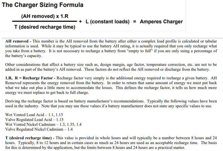 B/C의 용량은 BATTERY와 조금 다릅니다. B/C는 완전 방전이 되었을 때에 BATTERY를 충전하면서 동시에 부하에 전력을 공급할 수 있는 용량을 가져야 합니다. 아래 자료에서 잘 설명하고 있습니다. 수식은 방전된 용량에 재충전을 위해서 추가로 공급해야 하는 비율을 곱하고 이 것을 요구되는 충전시간 (보통 8-10시간)으로 나누면 BATTERY의 충전에 요구되는 전류값을 구하게 됩니다. 여기에 운전 중인 부하전류를 더하면 충전기 용량이 나오는데 실제는 여기에다 설계마진을 더해야 합니다. 재충전율은 BATTERY 회사에서 받든지 아니면 아래 자료에서 제시한 값을 사용해도 됩니다.