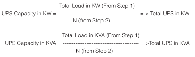 다음의 식으로 UPS의 용량을 계산합니다. 여기서 N은 UPS의 수량입니다. 즉 전체 용량을 몇 대의 UPS로 커버할 것인지를 결정하여 UPS 수량을 정하는 것입니다. SK이노베이션에서는 UPS를 단상 60 KVA 이하로만 사용한다고 들었습니다. 이는 UPS의 용량이 커지면 고장의 위험도 커지고 또 3상으로 해도 고장의 위험이 커진다고 합니다. 그래서 오랜 경험으로 그렇게 사용한다고 공장의 전기 담당 임원에게서 들었습니다.