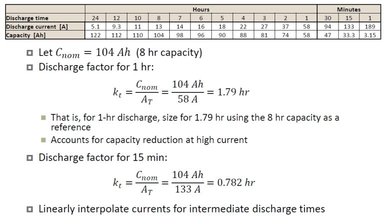 (4) BATTERY는 주변 온도에 따라 용량에 영향을 받으므로 메이커의 자료에 따라 추가로 보정을 할 필요가 있습니다. 온도 보정 계수가 BATTERY 용량 계산 시 반영되어야 합니다.