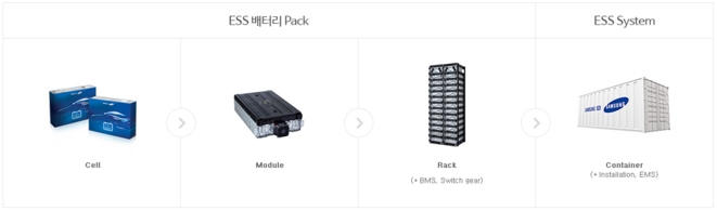 ESS는 배터리 (셀, 모듈, 팩), PCS, EMS, BMS 등으로 이루어져 있습니다.