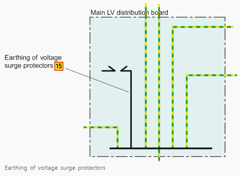 이 접지는 과전압의 해소를 위해 발생한 고장전류를 방전시키기 위해 설치된 것입니다. 이 도체는 가능한 한 짧게 설치하고 이 용도로만 사용해야 합니다. 최소 단면적은 제조업체의 가이드에 따르면 되는데 일반적으로 4-16mmsq를 사용합니다.