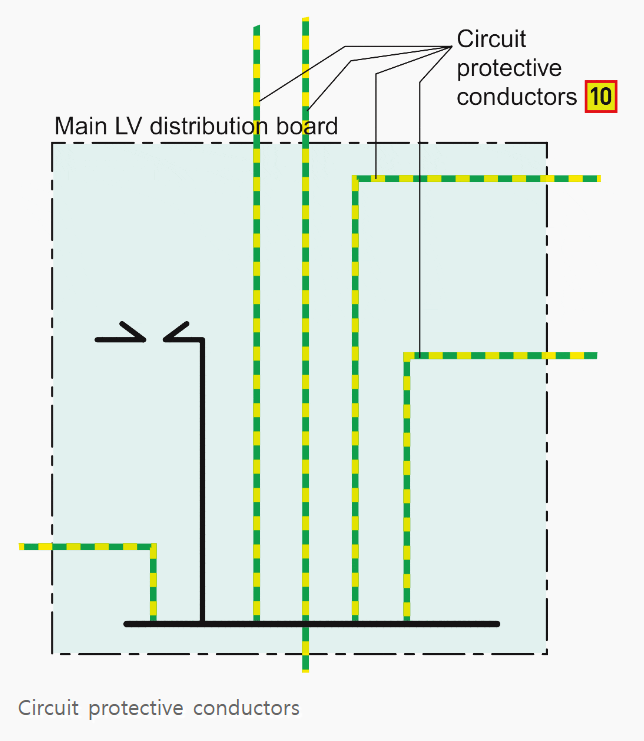10) 회로 보호 도체 (Circuit protective conductor) (KEC - 보호 도체) KEC에서는 상세하게 구분하지 않고 PE나 PEN으로 표시하는데 여기서는 상세히 구분하고 있음.