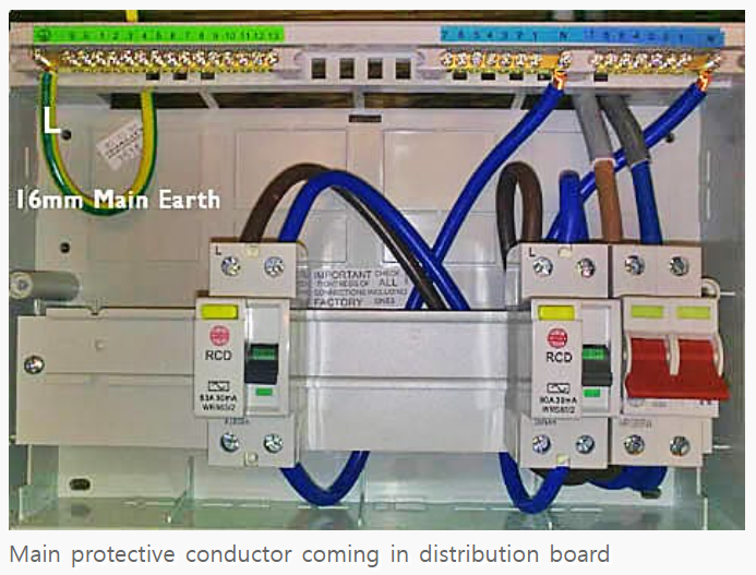 주 배전반 근처의 도전부를 보호 도체 단자에 연결하는 도체. 위와 같이 단면적은 보호도체의 단면적과 동일해야 합니다. 즉 최소 6mmsq에서 최대 25mmsq입니다. (알루미늄은 10 - 35mmsq입니다)