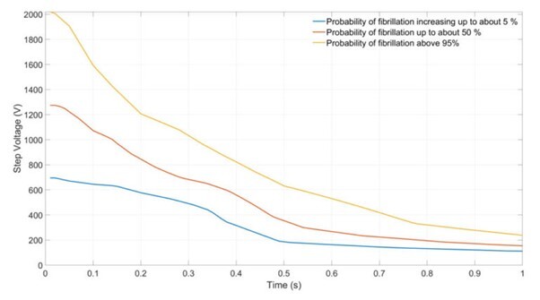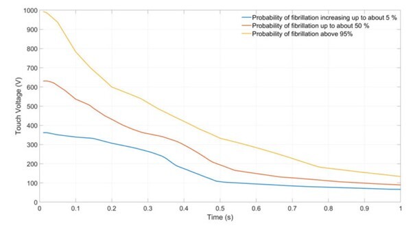 IEC 60479의 안전 한계는 고장 전류가 심장의 T-위상(약400ms 주변에서 발생)과 간섭하는 최근 지식을 기반으로 합니다. 이것은 심장의 섬유막 진동을 더욱 일으킬 가능성이 높습니다. IEC60479는 심장 전류 인자와 신체 인자를 사용하여 다른 신체 경로를 통한 전압을 계산할 수 있도록 합니다.