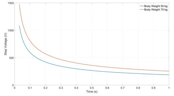 한계 임계 전류는 IEC 60479-1:2010의 그림 20의 심실 세동 확률 50% C2 곡선(충격 지속 시간 대 인체 전류)에서 결정됩니다.