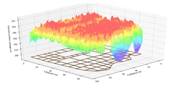 안전한 접지 시스템 설계에는 두 가지 목표가 있습니다. 장비의 한계를 초과하지 않고 정상 및 고장 전류를 운반하는 수단을 제공하고, 지상 시설 근처의 사람이 위험한 전기 충격에 노출되는 위험을 줄이는 것입니다. 일반적인 지락사고 상태에서 지락 전류의 흐름은 변전소 내외부에서 전압 등고선을 생성합니다. 그림 1은 132 kV 변전소의 지락 상태에서의 표면 전압 등고선을 보여줍니다. SafeGrid Earthing Software가 모델링을 수행하는 데 사용되었습니다.