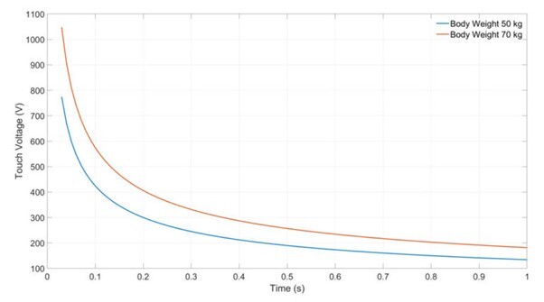 IEEE Std. 80에 대한 접지 및 단계 전압 계산은 몸무게가 50kg와 70kg인 경우에 수행됩니다. 표준 신체 임피던스인 1000Ω가 사용됩니다. 그림 6과 그림 7은 결함 클리어링 시간이 0.03초에서 1초까지 변화하는 허용 가능한 접지 및 단계 전압을 보여줍니다.