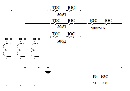 과전류 계전기는 아래 그림과 같이 CT의 2차 측에 설치하며 각 상마다 설치하고 필요시 중성선에 지락과전류 계전기를 설치합니다. 아래 그림에서 TOC는 한시, IOC는 순시 특성을 나타냅니다.