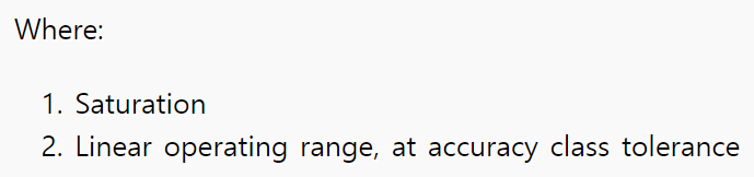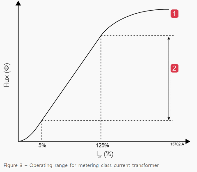 미터링 클래스는 정격 1차 전류의 5~125%에서 CT 2차 전류의 정밀도를 나타냅니다. 이 레벨 이상에서는 CT가 포화하기 시작하고 2차 전류가 고정되어 연결된 미터링 기기의 입력단을 보호합니다.