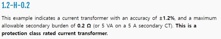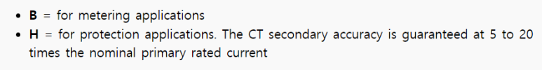 B는 계측기용이고 H는 보호 계전기용입니다. 보호 계전기용 CT의 2차 정확도 등급은 1차 정격 전류의 5 - 20배 사이에서 보장되는 값입니다.