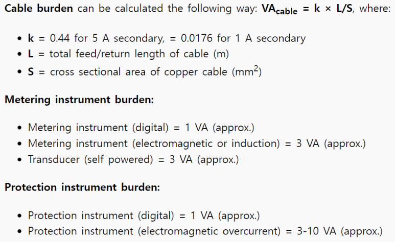 CT의 실제 출력 등급은 CT 2차 장치에 대한 예상 총부담보다 다음으로 높은 공칭 크기여야 합니다. 총부담은 출력 케이블, 커넥터 및 계측기의 합계입니다.