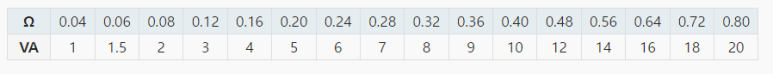 다음 표는 2차 전류가 5A인 경우 옴 단위의 부담을 VA로 변환합니다.