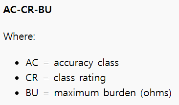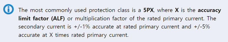 (가장 일반적으로 사용되는 보호 등급의 5PX이며 여기서 X는 정확도 한계 요소 (ALF)라고 하며 정격 1차 전류의 배수입니다. 2차 전류는 정격 1차 전류에서 +/-1% 오차를 가지며 X배의 과전류에서는 +/-5% 의 오차를 가집니다. )