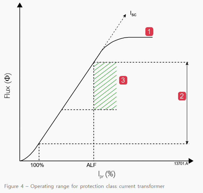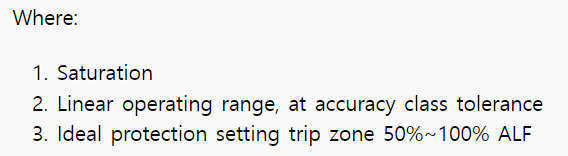 계전기 트립 설정은 일반적으로 최대 부하 전류의 10~15배이며 이 레벨은 CT 2차 전류 곡선의 선형 부분에 포함되어져야 합니다. 계전기 트립 레벨에 도달하기 전에 CT가 포화될 경우 고장이 감지되지 않은 상태로 유지되어 장비 손상 및 사람에게 심각한 위험이 발생합니다.