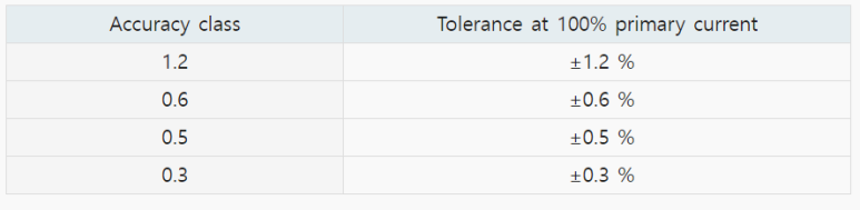 이 정확도 등급은 1차 정격 전류에 대한 2차 전류의 정확도를 표시합니다. 이 정확도는 CT의 2차 부하가 최대 부담을 초과하지 않는 경우에만 보장됩니다.