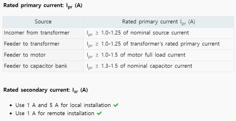 CT의 1차 전류 정격은 측정하려는 예상 최대 전류보다 커야 합니다. 계측용 CT의 1차 정격 전류는 최대 전류의 1.5배를 초과하면 안 됩니다. 보호계전용의 CT 1차 정격 전류는 고장전류가 흐를 동안 보호 검출 값을 얻을 수 있는 값으로 선정되어야 합니다.