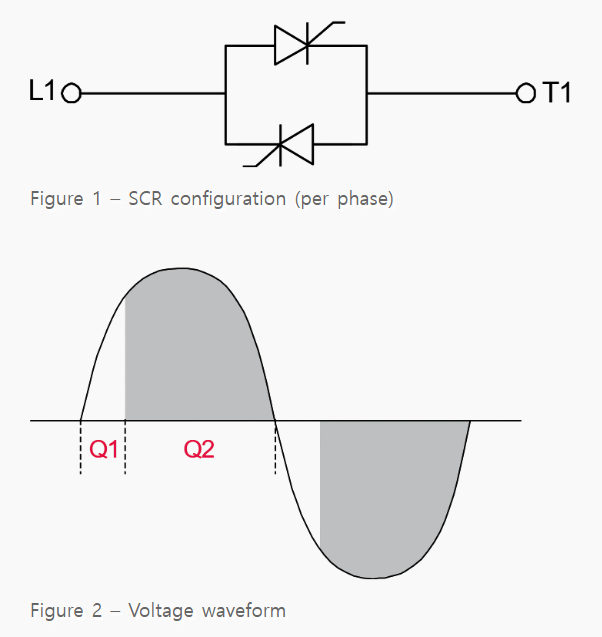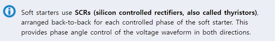 소프트 스타터는 SCR을 사용하는데 이는 소프트 스타터의 각 제어된 위상별로 백투백으로 배치되어 있습니다. 이것은 양방향에서 전압 파형의 위상 제어를 제공합니다.