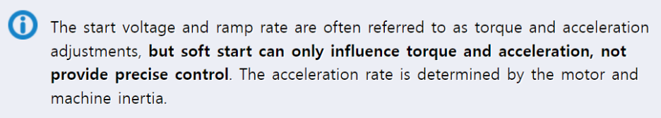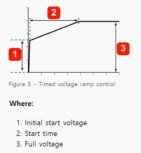 높은 관성 부하는 전류를 최소화하려면 느린 램프 시간이 필요합니다. 시작 전압이 빠르게 상승하면 전류가 직입 기동 전류(Locked rotor current)에 접근할 수 있습니다. 낮은 관성 부하는 짧은 램프 시간이 필요합니다. 시동 시간이 지나치게 길면 모터가 최대 속도에 도달한 후 안정적으로 작동하기 위한 전압이 부족할 수 있습니다.