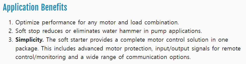 - 단순성. 소프트 스타터는 하나의 묶음으로 완벽한 전동기 제어 해법을 제공합니다. 이것은 진보된 전동기 보호와 원격 제어와 감시를 위한 입출력 신호들 그리고 넓은 범위의 통신 옵션들을 제공합니다.