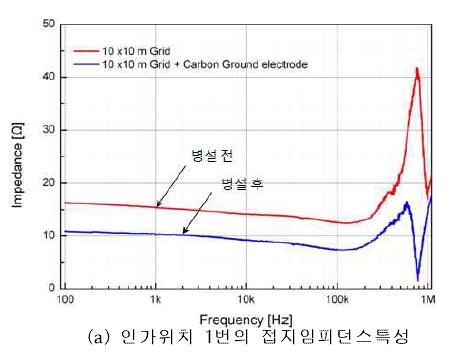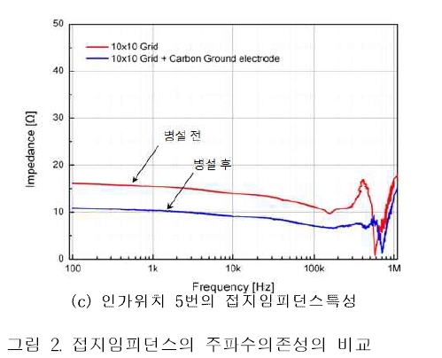 위 그림에서 보여주는 것은 탄소 접지봉을 병설하였을 때는 MESH 접지극만 있을 때와 비교해서 접지저항이 5-6 OHM 정도 낮아졌다는 것과 200KHZ 주파수 근처에서는 접지 임피던스가 급격히 높아지는데 탄소 접지봉이 있을 때는 높아지는 값이 현저히 낮은 것을 볼 수 있습니다.