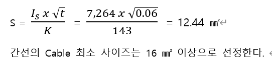 간선의 케이블 사이즈 선정 시에는 단락 전류에 의해 Cable이 소손되지 않도록 사이즈를 선정할 필요가 있다. 케이블 사이즈는 다음과 같이 선정한다.