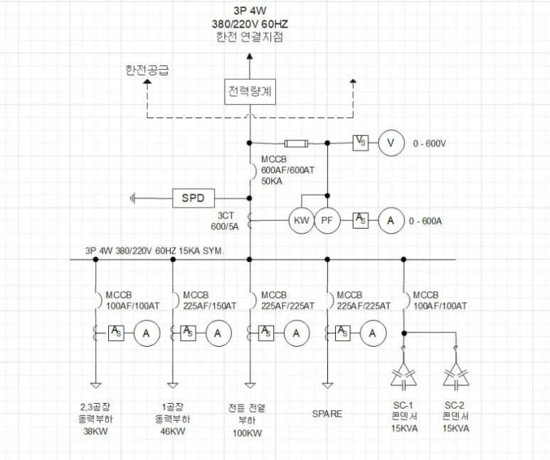 상기와 같은 내용을 기준으로 전기 단선도를 작성합니다. 주로 건축쪽에서 건축 관련 단선도를 작성하기 때문에 이 메인 단선도는 공장부하와 건축 메인을 포함하고 역률보상 콘덴서를 추가하는 것이 일반적입니다.