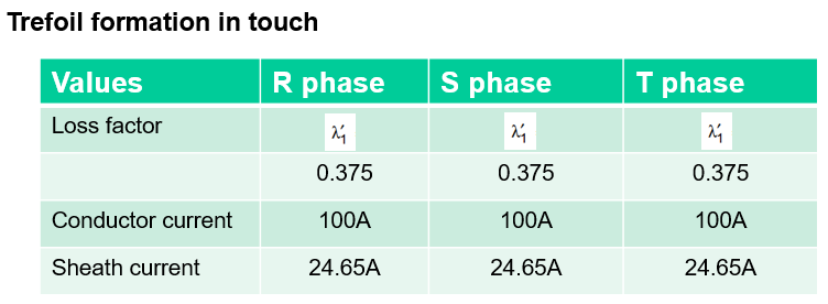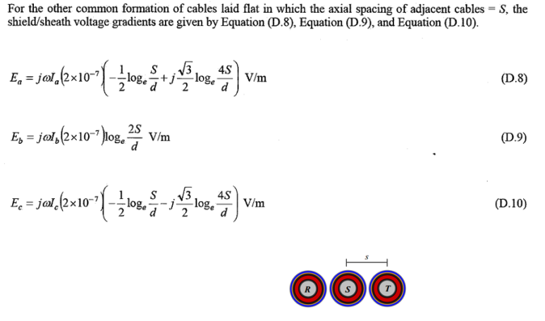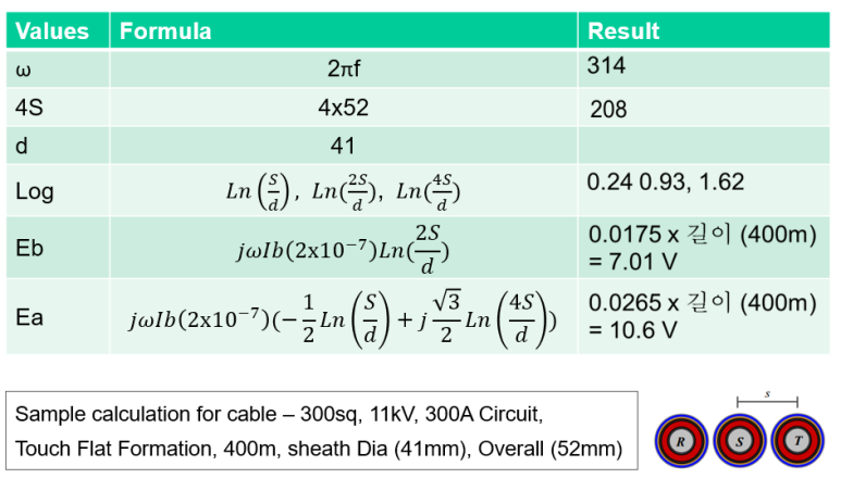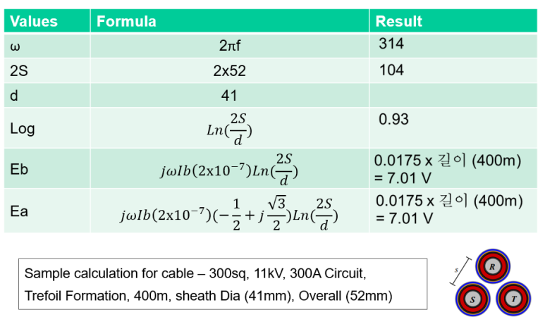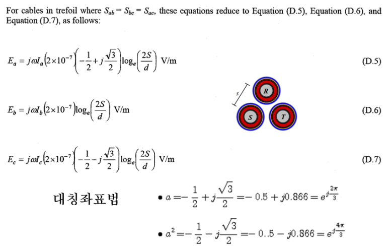 시스에 유도되는 전압의 크기에 대해서는 IEEE575에 잘 나타나 있습니다. 복잡한 원론적 수식이 있지만 여기서는 일반적으로 케이블 포설에 적용되는 삼각배치 (TREFOIL)와 수평배치 (FLAT) 시의 유기전압에 대한 수식을 설명합니다.