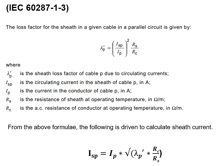 그리고 이렇게 구해진 Loss Factor를 가지고 IEC 60287-1-3에 있는 다음 수식을 이용해서 Sheath에 흐르는 전류를 계산할 수 있습니다.