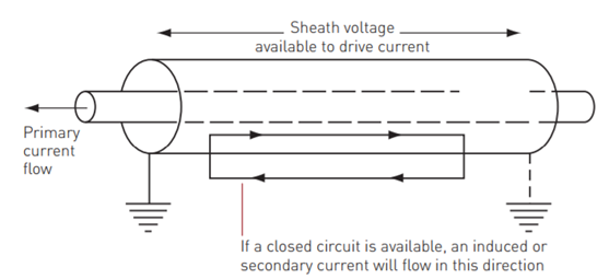 케이블에 시스가 있으면 중심도체와 시스 간에 전자기연결 (Electromagnetic coupling)이 발생하여 Faraday의 법칙에 따라 시스에 유기 전압이 발생합니다.