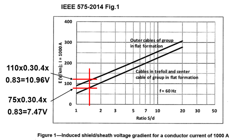 IEEE 575에서도 이와 같은 결과가 보이는 수계산용 그래프를 제공하고 있습니다. 아래 그림에서 그래프를 이용해서 수계산을 한 결과를 보여주고 있습니다. 그래프 상에서 보면 수평배치의 외부 전선과 수평배치의 가운데 전선 및 삼각배치의 전선들이 서로 다른 전압 커브를 가지고 있음을 보여주고 있습니다.