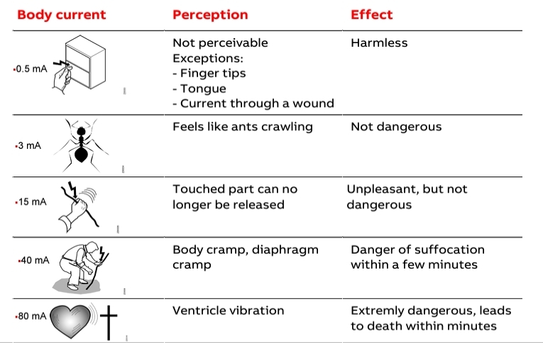 | 0.5mA | 자각증상이 없음 예외사항: 손가락 끝 혀 상처를 통한전류 |