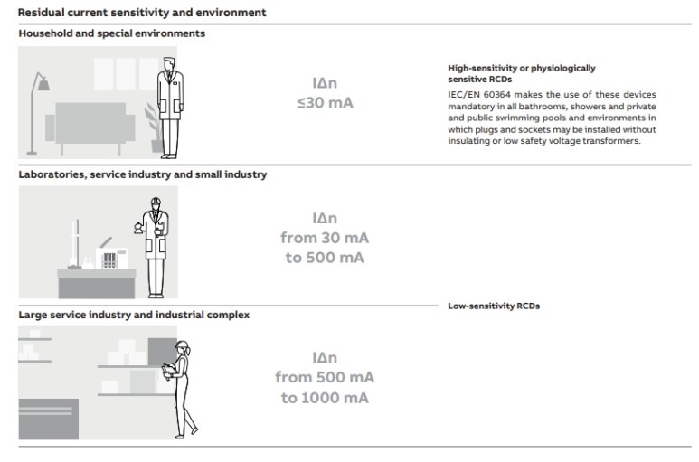 개략적 적용 기준은 다음 그림에서 보여줍니다. 인체 보호는 30mA, 소규모 공장 등은 500mA 이하 그리고 대규모 공장은 1000mA까지 사용 가능합니다.